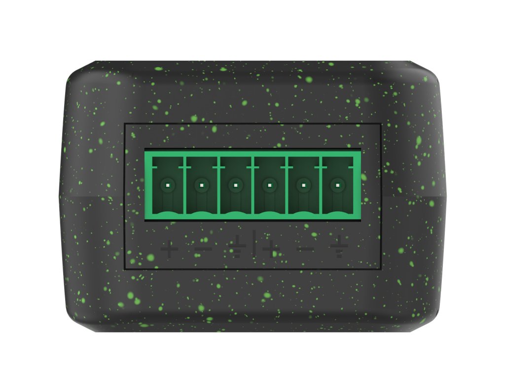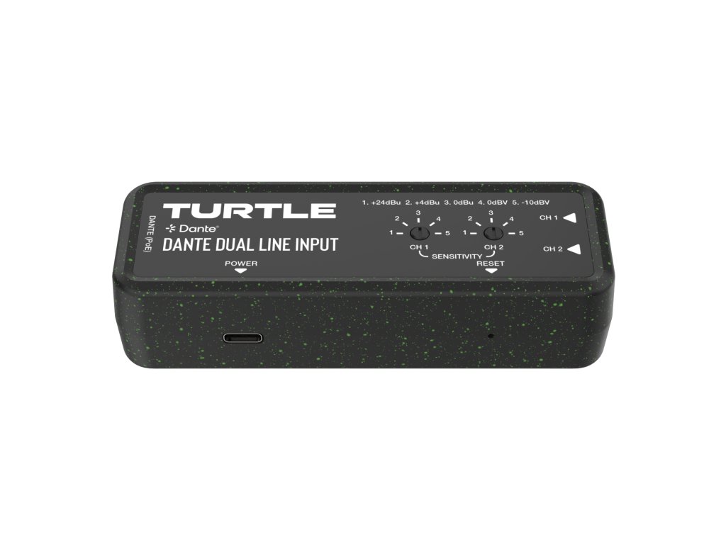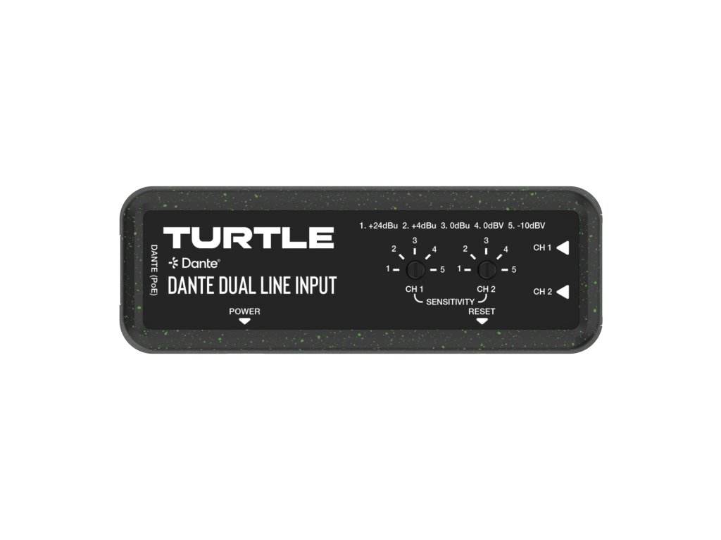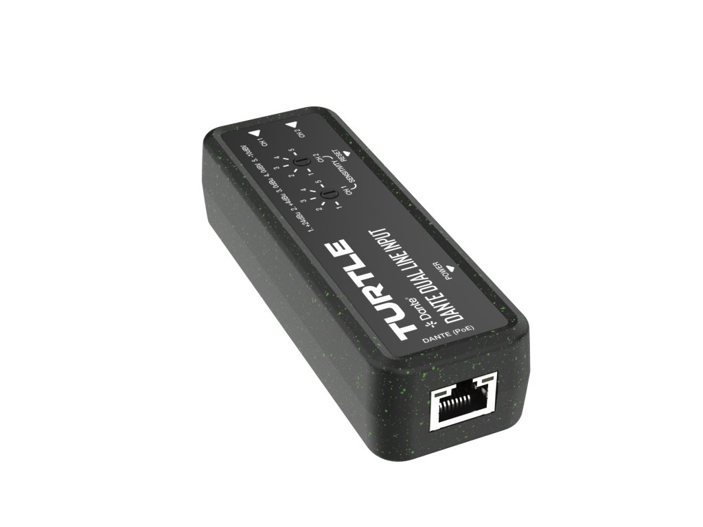 Turtle AV TAV-D2LEN Dante Dual Channel Analog Line Input Adapter with Gain Controls. Made from 90% recycled plastic, including 5% Ocean Bound Plastic.