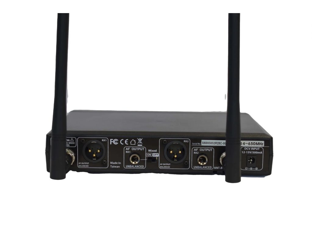 Duální bezdrátový mikrofonní přijímač, 2x1440 volitelných frekvencí v UHF pásmu 614-650MHz, 2x6 předdefinovaných skupin s až 22 kompatibilními kanály. Diverzitní příjem, funkce skenování přenosového pásma pro snadné nalezení volného kanálu, nastavitelná citlivost příjmu v rozsahu -5dB...+10dB. Patentovaná technologie ultrazvukové synchronizace nastavení přijímače a vysílače včetně nastavení vstupní citlivosti mikrofonu, intervalu automatického vypnutí vysílače a vysílacího výkonu. Podsvětlený LCD displej s indikací nastavení a stavu baterie vysílače, aktivní antény, RF i AF úrovně, výstupní úrovně. Odstup S/N >105dB, THD <0.6% (1KHz). Výstupy 1x symetrický XLR (Mic/Line) + 1x nesymetrický Jack 6,3mm (Line). Odnímatelné 1/2vlnné antény s konektory BNC.Doplňkové parametry