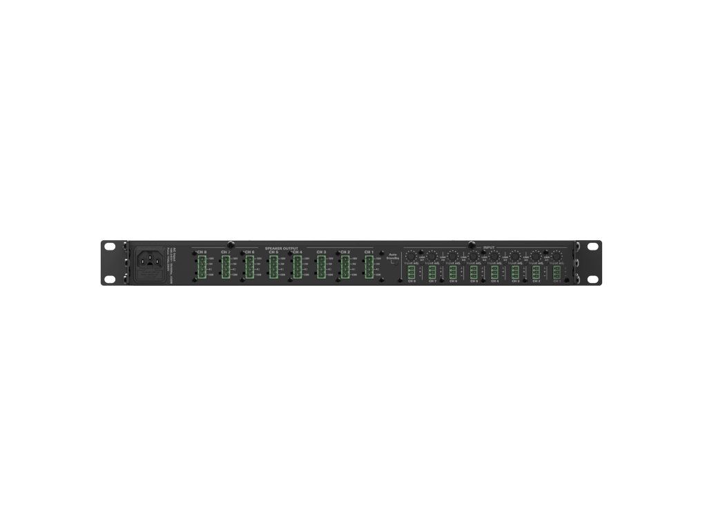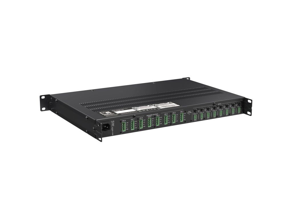 Koncový zesilovač s certifikací Energy Star, 8x30W @ 100V/70V/4Ohm (RMS), možnost volby výstupního napětí / zátěže individuálně pro každý kanál. Digitální topologie Class-D s vysokou účinností přes 80%, volitelný automatický Standby režim při absenci audio signálu s odběrem jen 0,7W, spínaný zdroj s rozsahem napájecího napětí 100~240VAC / 50~60Hz, pasivní chlazení pro bezhlučný provoz, ochrana proti DC na výstupu, zkratu, přetížení a přehřátí. Frekvenční rozsah 20Hz-20kHz @ ±3dB, odstup signál/šum >90dB, zkreslení THD+N <0,1% @ 1kHz. Na čelním panelu LED indikace přítomnosti audio signálu, max. vybuzení a aktivace ochran nezávisle pro každý kanál. Na zadním panelu regulace úrovně nezávisle pro každý kanál. Symetrické vstupy s konektory Euroblok 3pin 3,81mm, výstupy Euroblock 4pin 5,08mm. Provedení pro instalaci do 19" racku, výška 1HU, hloubka 330mm, hmotnost 4,7kg.Doplňkové parametry