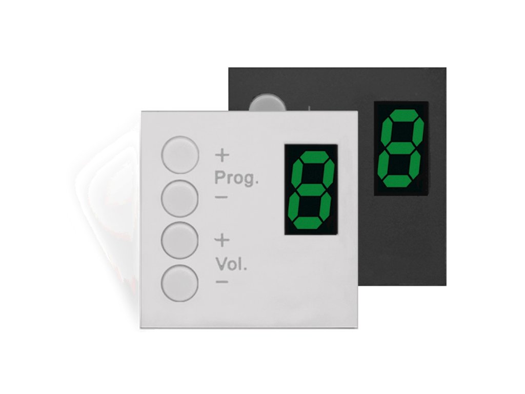 Nástěnný ovládací panel pro volbu zdroje a regulaci hlasitosti, 4 tlačítka, 7segmentový LED displej, rozměr panelu 45x45mm, bez obvodového rámečku, bílýDoplňkové parametry