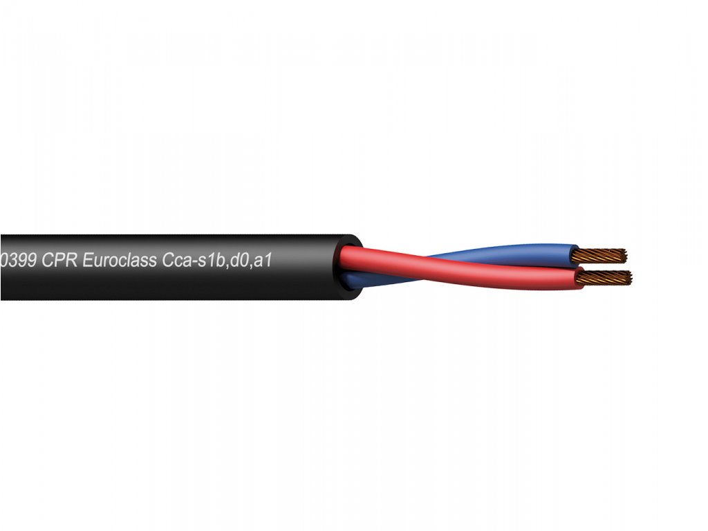 Reproduktorový kabel v souladu s Nařízením o stavebních výrobcích 305/2011/EU (CPR), EN50575, EN50399, třída reakce na oheň Cca-s1b,d0,a1, bezhalogenový. Průřez 2 x 1,5 mm² / 16 AWG, kroucené laněné vodiče z bezkyslíkaté mědi s 28 vlákny o průměru 0,25mm v každém vodiči. Stejnosměrný odpor 1,33 Ohmu / 100m, jmen. napětí 500V, dielektr. pevnost 2 kV/min (ss). Vnější průměr 7mm, potisk pláště s délkovými značkami á 1m. Návin 100m.Doplňkové parametry