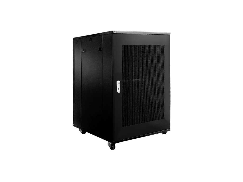 19" rozvaděč 18U dle ANSI/EIA RS-310D, DIN41491 a IEC60297, 600x800mm (ŠxH), barva černá RAL9004. Přední i zadní dveře z ocelového plechu s hexagonální perforací pro maximální pasivní ventilaci, se zámkem a zavěšením na pantech s možností změny orientace, odnímatelné bočnice pro snadný přístup ze strany. Hloubkově posuvné přední i zadní 19" profily s číslováním pozic pro rychlou orientaci, nastavitelná vzdálenost až 740mm. Pevná svařovaná konstrukce ze za studena válcované oceli tl. 2mm (rám) / 1,2mm (plechy), max. zatížení 800kg stat. (na nohách) / 400kg dyn. (na kolečkách). Dodávka v kompletně sestaveném stavu, součástí dodávky 50mm transportní kolečka, stavitelné nohy a sada montážního materálu pro 19" zařízení.Doplňkové parametry