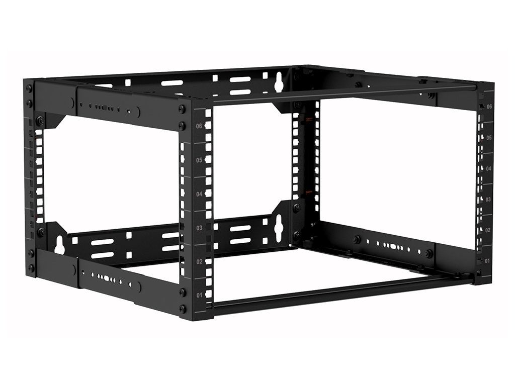 19" otevřený rack 6U pro stojanovou / nástěnnou / stropní instalaci nebo vestavbu do nábytku, hloubka nastavitelná v rozsahu 300-450mm, číslované výškové pozice. Materiál ocel tl. 2mm, nosnost 100kg (stojící) / 50kg (zavěšený), rozebíratelný, dodávka v rozloženém stavu. Součástí balení 4x stavitelná noha, 4x kotva do zdi M8, 24x sada klecová matka + šroub. Rozměry (ŠxVxH) 520x291x300-450mm, hmotnost 8kg, barva černá.Doplňkové parametry