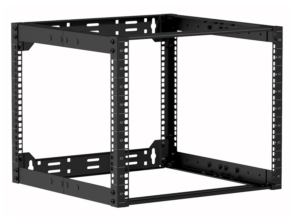 19" otevřený rack 9U pro stojanovou / nástěnnou / stropní instalaci nebo vestavbu do nábytku, hloubka nastavitelná v rozsahu 500-800mm, číslované výškové pozice. Materiál ocel tl. 2mm, nosnost 100kg (stojící) / 25kg (zavěšený), rozebíratelný, dodávka v rozloženém stavu. Součástí balení 4x stavitelná noha, 4x kotva do zdi M8, 20x sada klecová matka + šroub. Rozměry (ŠxVxH) 520x425x500-800mm, hmotnost 8,5kg, barva černá.Doplňkové parametry