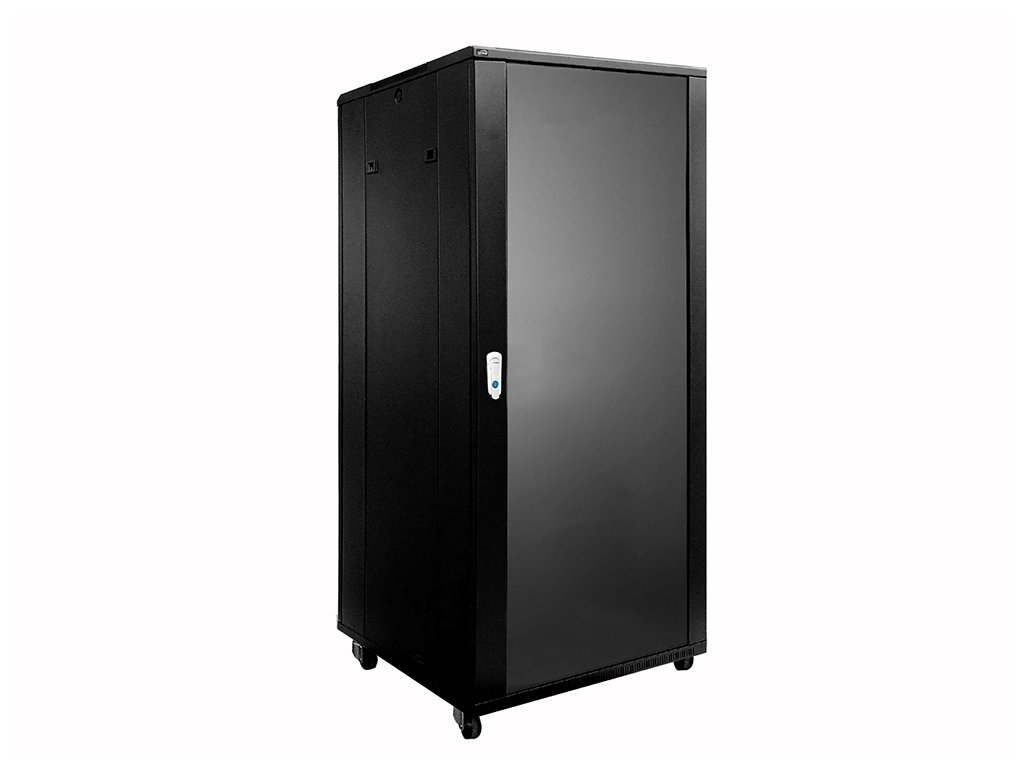 Rozvaděč 19" 27U dle ANSI/EIA RS-310D, DIN41491 a IEC60297, 600x600mm (ŠxH), barva černá RAL9004. Přední dveře s temperovaným sklem, přední i zadní dveře se zámkem a zavěšením na pantech s možností změny orientace, odnímatelné bočnice pro snadný přístup ze strany. Hloubkově posuvné přední i zadní 19" profily s číslováním pozic pro rychlou orientaci, nastavitelná vzdálenost až 540mm. Pevná svařovaná konstrukce ze za studena válcované oceli tl. 2mm (rám) / 1,2mm (plechy), max. zatížení 800kg stat. (na nohách) / 400kg dyn. (na kolečkách). Dodávka v kompletně sestaveném stavu, součástí dodávky 50mm transportní kolečka, stavitelné nohy a sada montážního materálu pro 19" zařízení.Doplňkové parametry